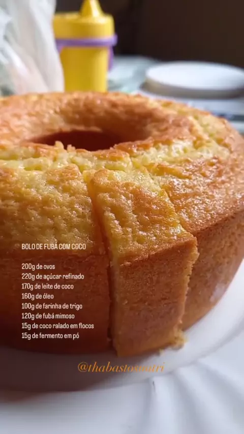 BOLO DE FUBÁ COM COCO MODO DE FAZER Bata no liquidificador o açúcar e os ovos ,adione o leite de coco e o óleo bata mais 1 minuto, misture os ingredientes secos trigo,fermento,fubá e o coco ralado Misture com a mistura do liquidificador coloque em uma fôrma untada com desmoldante ou margarina e trigo leve a assar en forno 180graus até dourar ou tocar e estar fofo e macio.
