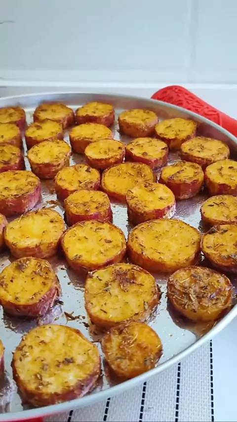 O SEGREDO DA BATATA DOCE ASSADA PERFEITA Ingredientes: 4 batatas doces 40ml de azeite 1 colher (chá) de páprica defumada 1 pitada de pimenta do reino 1 colher (chá) de tomilho 1 colher (sopa) de sal para cozinhar as batatas Água para cozinhar as batatas Cheiro verde para finalizar a gosto Modo de preparo: No vídeo. Obs: Asse em forno pré-aquecido a 200⁰C por aproximadamente 40 minutos ou até notar que estejam bem douradinhas.