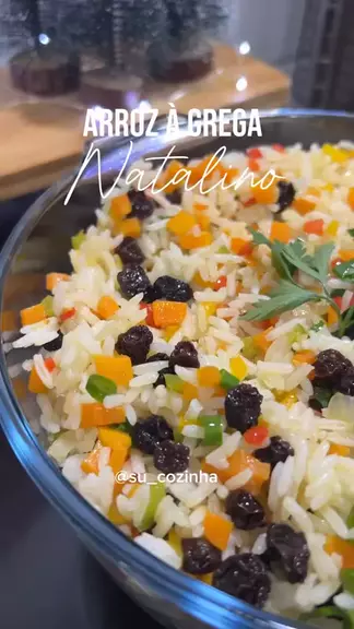Arroz à grega para seu natal Ingredientes • 3 xícaras de arroz pronto •Azeite a gosto • 1 cebola pequena picada • 1/3 xícara de cada pimentão picado (3 cores) •1 xícara cenoura cortada em cubinhos •Uva passa a gosto • Cebolinha picada O arroz cozinhei com alho e sal. Não precisa usar muito azeite mas também não use tão pouquinho, é nesse azeite que vai ficar o sabor de tudo que foi refogado e irá envolver o arroz. Se ficar ainda alguma dúvida só deixar nos comentários que respondo! #receita