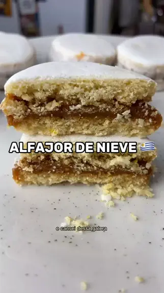 Receita do melhor alfajor de nieve 🤤🇺🇾 Ingredientes: 100g manteiga, 50g açúcar, 25g mel, raspas de uma laranja, baunilha, 1 ovo, 200g farinha de trigo, colher de sobremesa de fermento quimico, colher de cha de bicarbonato, pitada de sal. Calda: 100 açúcar, 45g de agua. 100g açúcar de confeiteiro, clara de um ovo, suco de meio limão. Doce de leite para o recheio. #receitadealfajor #alfajor #alfajordenieve