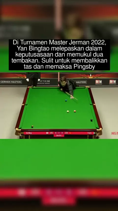 Pada Kejuaraan Master Jerman 2022, Yan Bingtao melepaskan tembakan dalam keputusasaan dan membalikkan tas dengan dua tembakan untuk membuat Selby