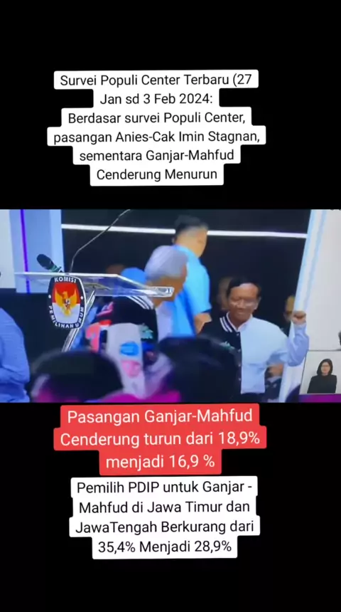 Survei Populi Center Terbaru (27 Jan sd 3 Feb 2024: Berdasar survei Populi Center, pasangan Anies-Cak Imin Stagnan, sementara Ganjar-Mahfud Cenderung Menurun. Pasangan Ganjar-Mahfud Cenderung turun dari 18,9% menjadi 16,9 %. Survei ini juga menemukan Pemilih PDIP untuk Ganjar - Mahfud di Jawa Timur dan JawaTengah Berkurang dari 35,4% Menjadi 28,9%.#CekFaktatvOne#CariBeritaditvOne#PrabowoSubianto#Capres2024#DebatCapresKetiga#Pilpres2024#Politik#KamiKabarkanAndaPutuskan#MauMemilih#tvOneTVPemilu#...