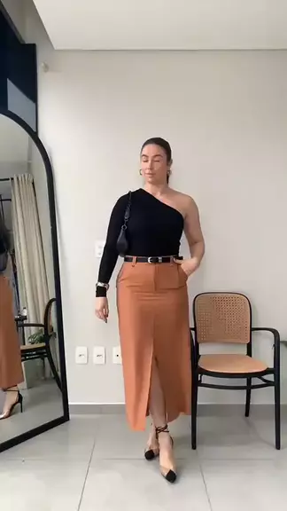 Saia Midi Femininoa Alfaiataria com Cinto e Bolso Moda Evangélica #kwaishop #modaevangélica #alfaiataria #fy #kwai
