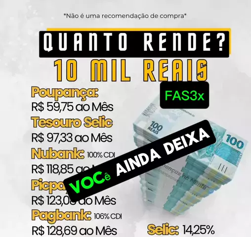 FAS3x - EDUCAÇÃO FINANCEIRA Você ainda deixa dinheiro na poupança? Enquanto ela te rende R$ 59,75 por mês, tem gente fazendo mais que o dobro com investimentos simples e acessíveis. Chega de perder dinheiro parado e entenda o poder do CDI e coloque seu dinheiro pra trabalhar de verdade. Se até o Nubank e o Pagbank estão rendendo mais... por que você ainda insiste na poupança? Ainda existe uma opção que é melhor do que todas essas. Quer saber qual é? Comenta "eu quero"