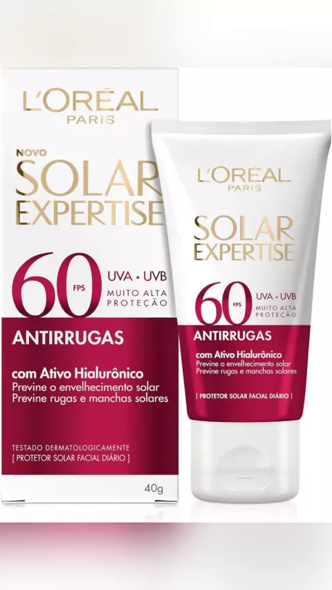L'Oréal Paris Protetor Solar Facial Antirrugas FPS60 com Ativo Hialurônico Solar Expertise, 40g Promoção R$26,79 Diga eu quero nos comentários