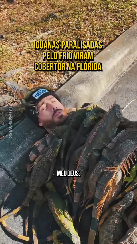 Onda de frio: homem se aquece com dezenas de iguanas