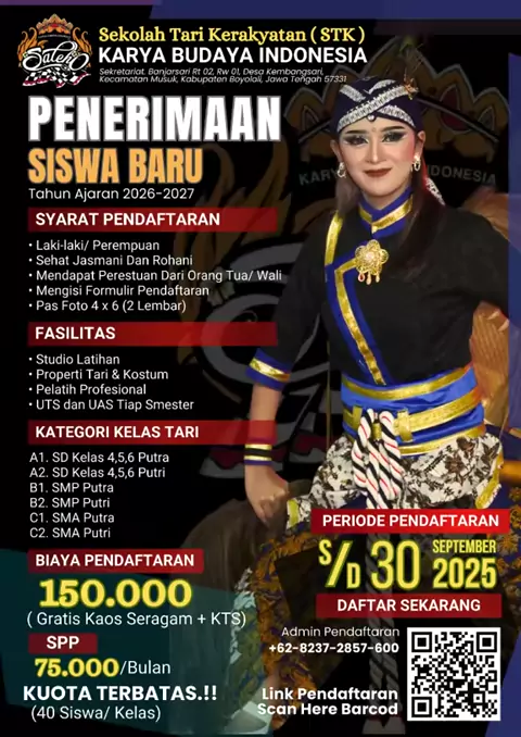 DARI RAKYAT UNTUK RAKYAT *TELAH DIBUKA.......!!!* *SEKOLAH TARI KERAKYATAN KARYA BUDAYA INDONESIA* Dulu kami hadir di panggung untuk menghibur, Kini kami hadir di kelas untuk berbagi ilmu. 馃拑 Mari menari bersama di **Sekolah Tari Kerakyatan Karya Budaya Indonesia**! 馃搷 Daftar sekarang, kuota terbatas! Cara Mendaftar: Scan Barcode pada poster pendaftaran atau klik tautan di bawah ini. Link Pendaftaran: https://forms.gle/YWvYjCRkRjbw6Hxa8 Admin: 082372857600 (Tarno)