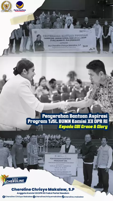 Penyerahan Bantuan Aspirasi Ibu Cheroline Chrisye Makalew, S.P, Anggota Komisi XII DPR RI melalui Program Tanggung Jawab Sosial Lingkungan (TJSL) BUMN PT. PLN kepada Gereja Bethany Indonesia (GBI) Grace & Glory. ๐ฆ๐ฎ๐น๐ฎ๐บ ๐ฅ๐ฒ๐๐๐ผ๐ฟ๐ฎ๐๐ถ !!!#CherolineChrisyeMakalew#NasDemMendengar#NasDemBergerak#NasDemPeduli#NasDemBersamaRakyaT