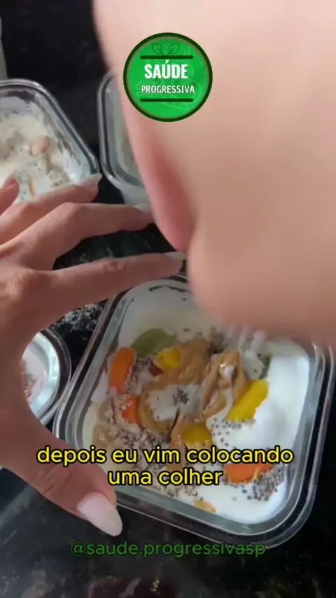 Overnight Oats de Frutas é aquela receitinha que você precisa fazer. Fica sensacional. INGREDIENTES: 170g de iogurte natural 1 colher de chia 1 colher de aveia Manga Uva Mamão 1 colher de pasta de amendoim. #receitassaudavel #gastronomia #dicasdereceita #overnightoats #frutas