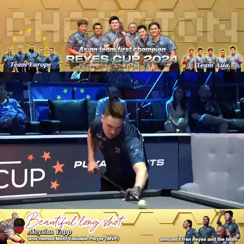 Team Asia becomes first champion in 2024 Reyes Cup in decider Aloysius Yapp VS Francisco Sanchez Ruiz on the final day of the 2024 Reyes Cup in Manila, Philippines. The Singaporean professional player showed a stunning performance against his opponent, Francisco Shancez Ruiz, who is ranked 1 in the world, with safety ball actions and a very beautiful and accurate long shot. #billiards #billiardsskills #9balltrickshot #SnackStyle #billiard