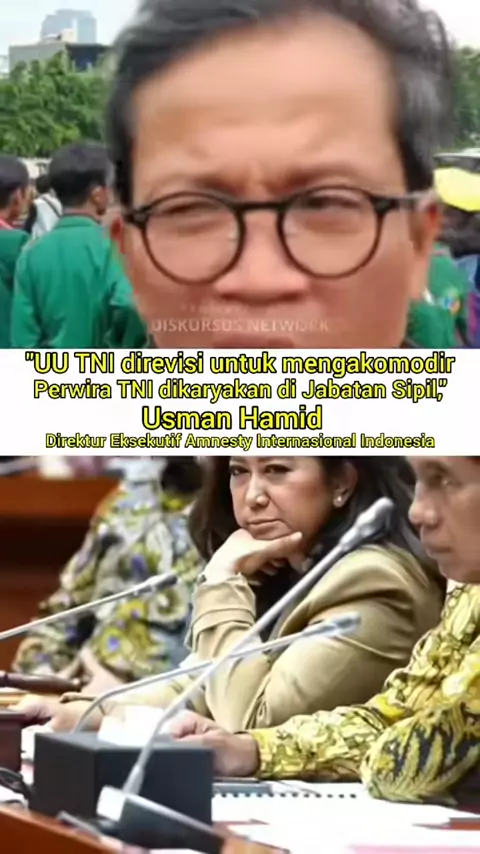 "UU TNI direvisi untuk mengakomodir Perwira TNI aktif yang numpuk gak kebagian jabatan oleh karena itu perlu dikaryakan di Jabatan Jabatan sipil," Kata Direktur Eksekutif Amnesty Internasional Indonesia, UsmanHamid