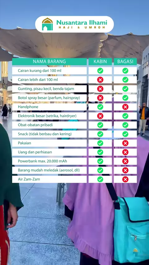 Save & Share! Biar nggak ada lagi drama salah masukin barang ke kabin atau bagasi ✈️ Tapi... kalau umroh bareng Nusantara Ilhami, kamu nggak perlu repot mikirin itu semua. Perlengkapan utama sudah kami siapkan, koper dan pengaturan bagasi pun sudah kami bantu urus. Jadi kamu bisa fokus ke yang paling penting: menata hati dan niat untuk beribadah. 🤍 Semoga infografis ini tetap membantu buat persiapan kecil lainnya, ya!