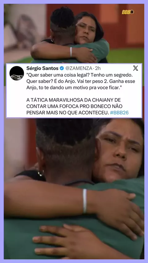 “Quer saber uma coisa legal? Tenho um segredo. Quer saber? É do Anjo. Vai ter peso 2. Ganha esse Anjo, tô te dando um motivo pra você ficar.” A fala de Chaiany virou assunto entre internautas, que apontaram a estratégia da sister ao soltar uma “fofoca” no meio da conversa como uma forma de desviar a atenção de Boneco após o clima tenso na casa. Para muitos, a tática foi vista como uma tentativa clara de fazer o brother esquecer o que tinha acabado de acontecer. #BBB26 🚨[para entender volte 1,