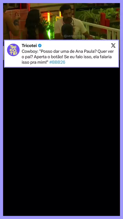 Cowboy imita Ana Paula em tom de brincadeira e dispara: “Posso dar uma de Ana Paula? Quer ver o pai? Aperta o botão!”. Na sequência, ele ainda comenta que, se fosse ele falando isso, ela provavelmente diria a mesma coisa para ele. #BBB26 🚨[para entender volte 2 posts] 📽️ Imagem/Reprodução | TV Globo
