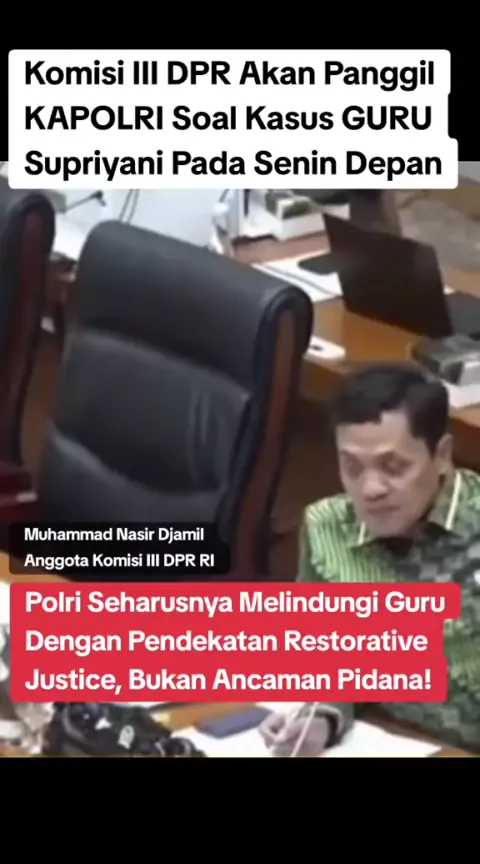Komisi III DPR RI akan memanggil Kapolri untuk meminta penjelasan soal kasus Supriyani, Guru honorer yang dituduh memukul Siswa kelas 1 SDN4 Baito, yang merupakan anak dari salah satu anggota Polri, pada Senin pekan depan. Anggota Komisi III DPR RI, Muhammad Nasir Djamil, mengatakan bahwa Polri seharusnya melindungi guru dengan pendekatan Restorative Justice, bukan ancaman pidana. Apalagi ada dugaan pemerasan sebesar Rp50 juta untuk menghentikan kasus tersebut. Saat ini Supriani berstatus Terda...