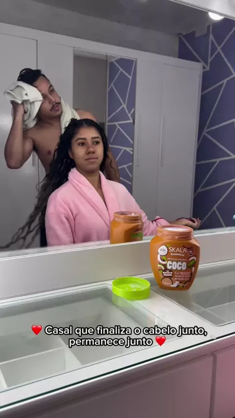 Meta: lavar e finalizar o cabelo juntinhos que nem a Isabella e seu boy. 💆♀️❤️💆♂️ Todo mundo sai ganhando: Dona Skala cuida dos fios dos pombinhos e eles ganham mais tempo pra se curtirem! 💖 #BelezaÉParaTodos #PotaoDeCoco #CabeloCacheado #Finalização #FinalizacaoDeCachos