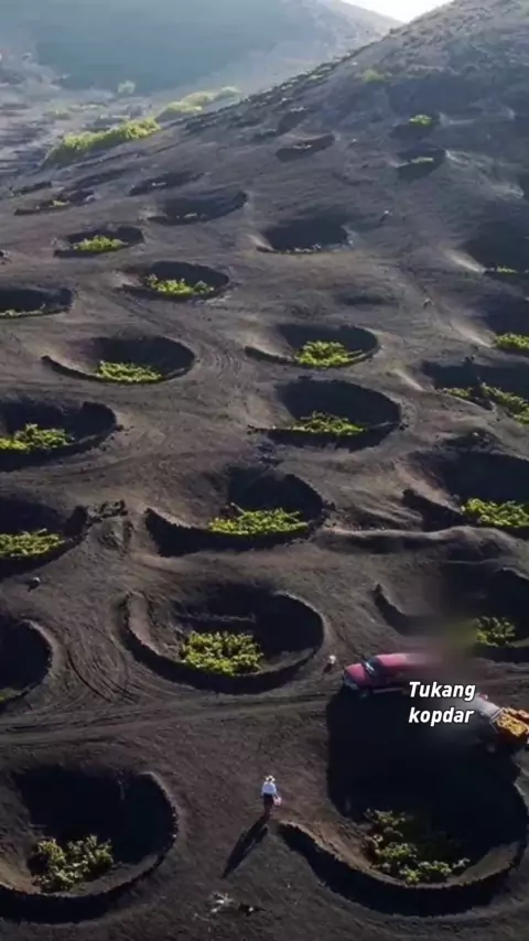 Ini bukan kebun sayur di pangkalan Mars, tapi kebun anggur di Lanzarote, Spanyol. Karena gunung berapi di pulau itu, tanahnya sangat subur, namun pada saat yang sama beriklim kering. Para petani menggali lubang-lubang besar dengan diameter beberapa meter dan menanam pohon anggur di tengahnya, dan angin musim hujan di malam hari menimbun air di dalam lubang. #