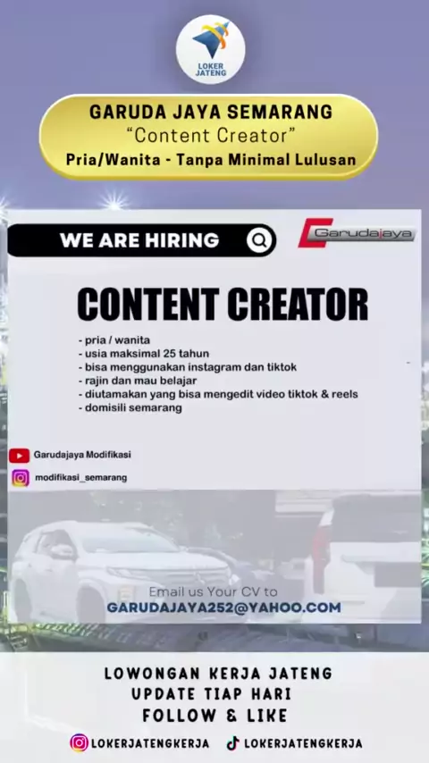 Lowongan Kerja Jawa Tengah Terbaru Posisi: Content Creator Lokasi: Semarang#lokercontentcreator#lokerkontenkreator#lokersemarang#lokersemarang2023#lokersemarangsekitarnya#lokerjateng#lokerjateng2023#lokerjawatengah#lowongankerja2023#lowongankerjajawatengah#lowongankerja#infoloker#infoloker2023#loker#loker2023#lokersmasmk#lokersmaterbaru#lokers1