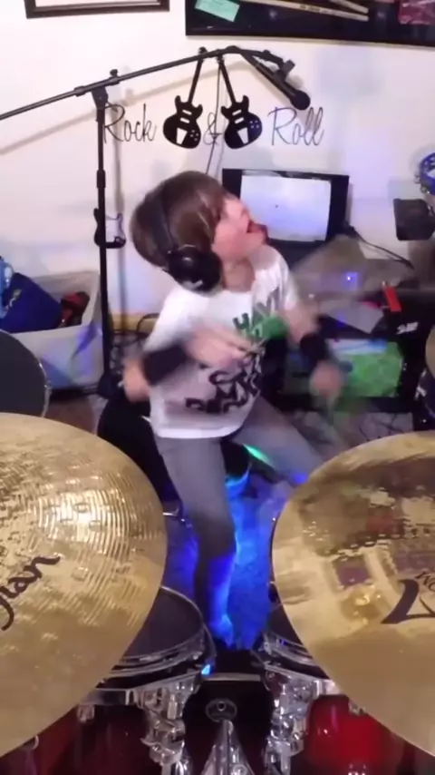 O moleque toca Bateria e gosta de Rock! 🥁🥁🥁🥁#yourlove #outfield #kid #drummer #viral