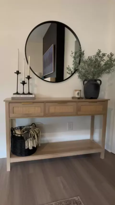 Estilizando minha mesa de console Um dos meus achados acessíveis favoritos da Amazon! Apenas US $136 e vem em uma versão de duas gavetas para espaços menores. in my Bi0 # amazonfinds # consoletable # consoletablestyling # entrywaytable # livingroomstyling # moderndesign # interiordecor # organicmodern # neutralaesthetic # sofatablestyling # entrywaydecor