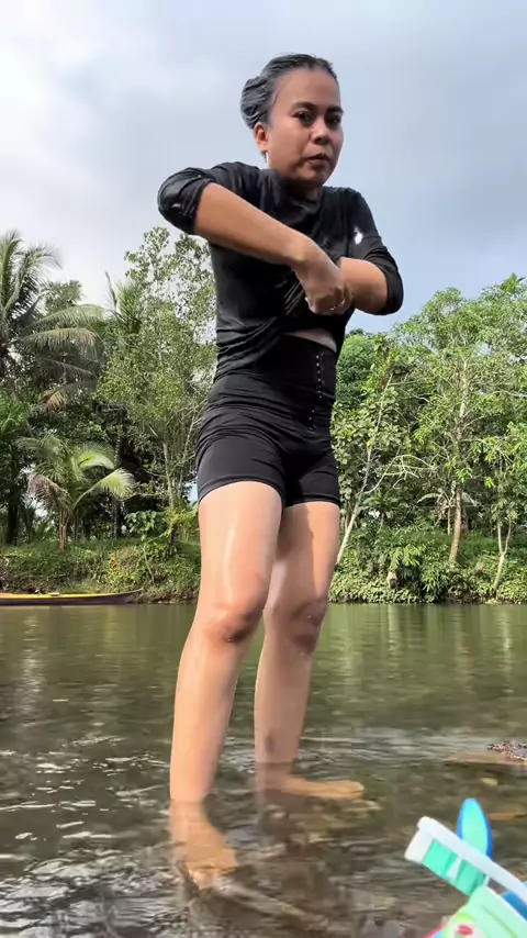 Buaya betina mandi di sungai Sekatak sambil makan durian