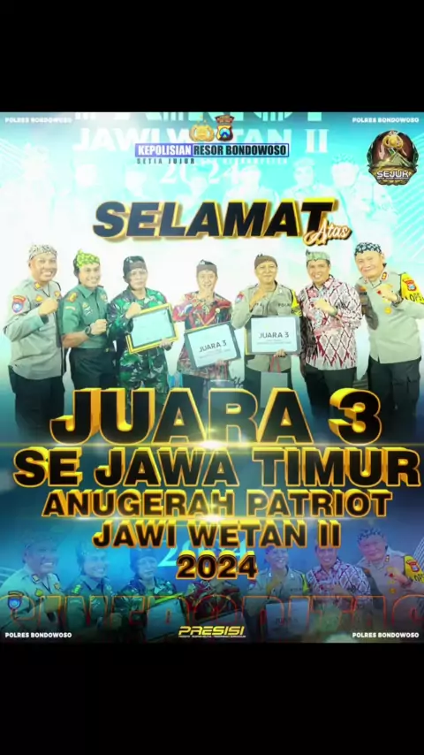 SINERGRITAS TIGA PILAR MENGHARUMKAN NAMA KABUPATEN BONDOWOSO TERUTAMA DI DESA SUMBER KOKAP. Bhabinkamtibmas, Bhabinsa, Perangkat Desa Sumber kokap berhasil raih Juara III APJW II Tahun 2024. Malam Awarding dihadiri oleh, Pj. Gubernur Jatim, Kapolda Jatim, PangKodam V/Brawijaya, Dahlas Iskan, Pejabat teras Pemprov Jatim, Polda Jatim dan Kodam V Brawijaya dan Harian Disway presents.