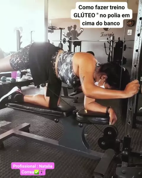 TREINÃOOO DE GLÚTEO🍑✅🏋🏻♀️ TREINO de Glúteo no polia em cima do banco. com movimento certo com execução correta. Profissional: Natalia Correa ✅💞