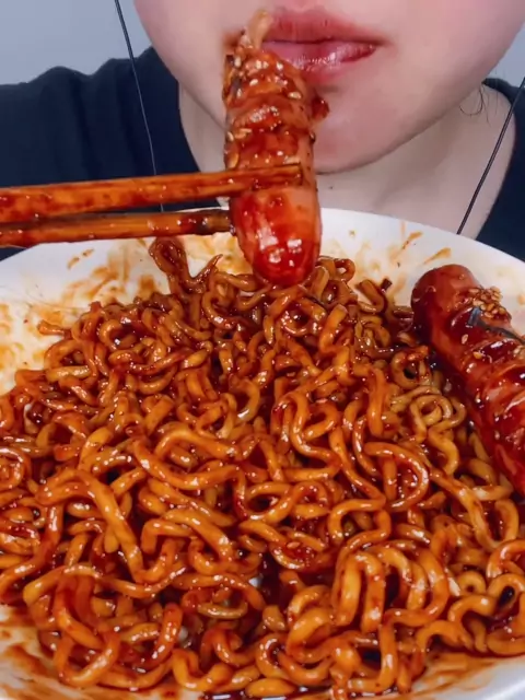 Selamat malam, Baoan. Makan mie Korea pedas lengket, kerupuk kerupuk.