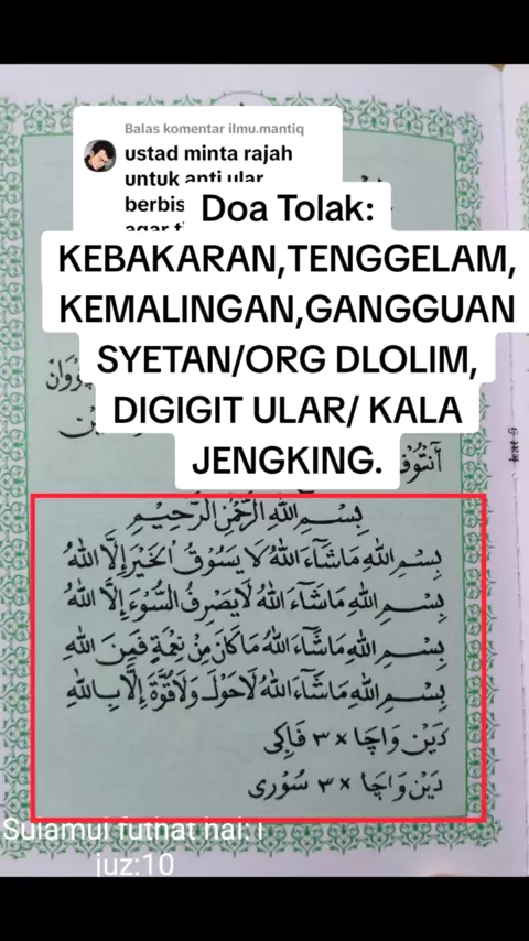 Membalas @ilmu.mantiq Do'a untuk menolak kebakaran,tenggelam,kemalingan,gangguan syetan,gangguan orang yg dlolim,digigit Ular/ Kala jangking. Caranya:Do'a ini dibaca rutin 3× setiap pagi( setelah solat subuh) setiap sore ( setelah solat magrib) كتاب سلم الفتوحات ص :١ جز : ١٠##DAWAMAcollection#istiqomah#Do'aTolak