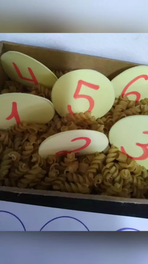 Jogo Trabalhando a Identificação dos números de 1 a 6 e coordenação motora fina. Os alunos devem retirar do macarrão os números utilizando o pregador de roupa. identificar e posicionar no papel no local correto (pareamento). #educacaoinfantil #ensinarcomamor #jogos #brincadeiras #aprender
