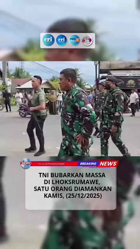 KBRN, Lhokseumawe : Personel TNI membubarkan massa yang beraksi di Jalan Nasional Banda Aceh–Medan, tepatnya di Simpang Kandang, Meunasah Mee, Kecamatan Muara Dua, Lhokseumawe, Kamis (25/12/2025). Dalam kejadian itu, seorang pria diamankan petugas. Komandan Korem 011/Lilawangsa, Kolonel Inf Ali Imran, menyebut pria tersebut diduga provokator sekaligus membawa senjata mematikan. “Sebelum diamankan, pria itu diduga menggiring kelompok menjadi anarkis dengan meneriakkan ajakan untuk melawan,” kata...