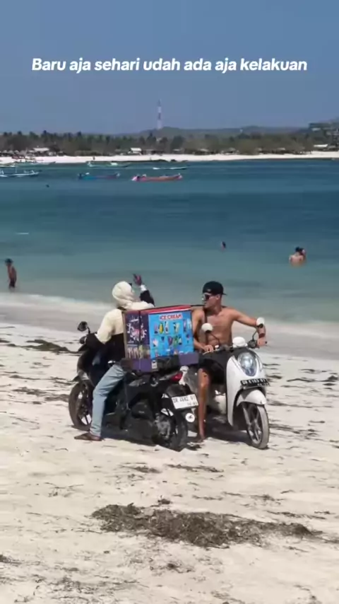 Rider Moto2 Filip Salac terlihat sedang jualan eskrim di Pantai tanjung Aan, Kuta Lombok##filipsalac#motogp#motogpindonesia#mandalika#lombok#wonderfulindonesia