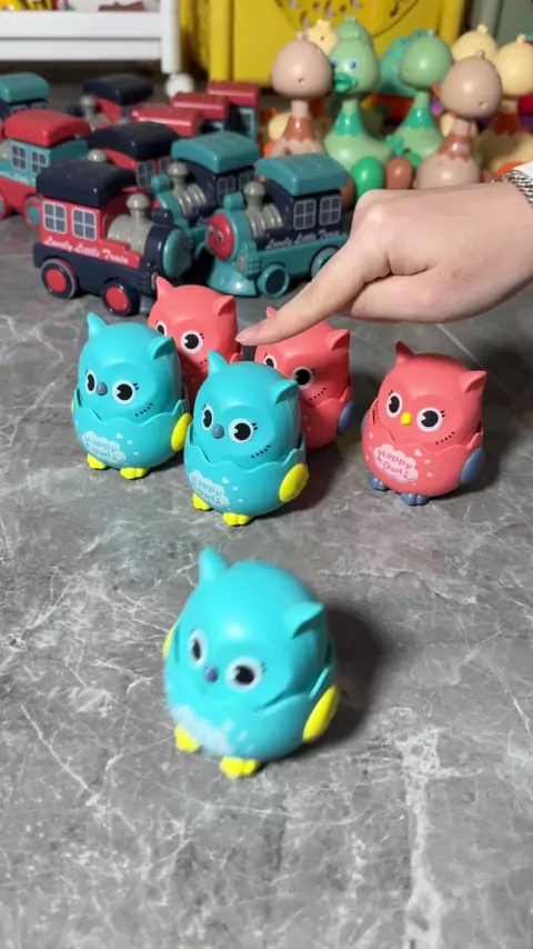 A coruja interessante e engraçada foge com um clique. O bebê gosta de pressioná-lo sozinho.
