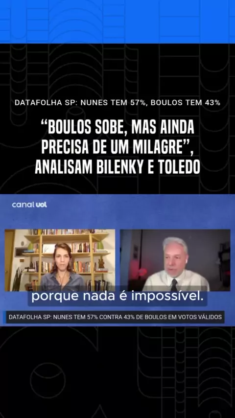 Na véspera do segundo turno, Ricardo Nunes (MDB) tem 57% dos votos válidos, contra 43% de Guilherme Boulos (PSOL), mostra nova pesquisa Datafolha sobre a disputa para a Prefeitura de São Paulo. No levantamento anterior, divulgado na quinta-feira (24), o emedebista tinha 58%, e o psolista, 42%. No “A Hora”, @thais_bilenky e @zerotoledo analisam o assunto. 🎙 Ouça o “A Hora” no seu tocador de podcasts favorito ou assista no nosso canal do YouTube. 📲 Siga @uolnoticias para ficar por dentro das p