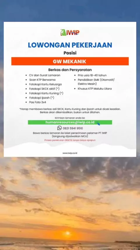 Hay sobat iwip,ayo merapat yg lulusan SMK atau yang punya sertifikat mekanik khusus KTP Maluku Utara khusu laki2#iwip_weda_halmahera#ptiwip๐๐๐#nonanonaiwip