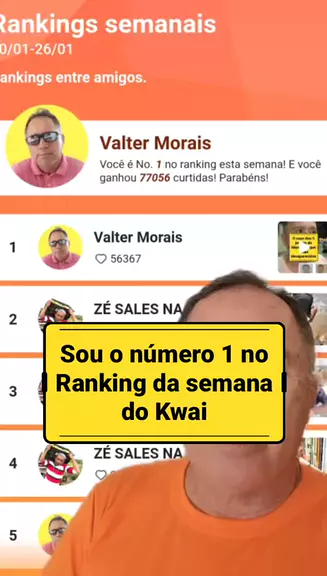 Essa semana eu sou o número 1 no Ranking dos criadores do Kwai. @O Paparazzi(O150001579401031) @ZÉ SALES NA VOZ(O150000034108134) @ZÉ DA ROÇA(O150000126514910) @NÊGO DO COENTRO(O1303963800) @Rivanildo Atitude(O150001262634967) @BrunoRios(O150001049206737)