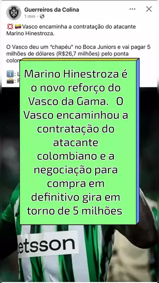 Marino Hinestroza é o novo reforço do Vasco da Gama. O Vasco encaminhou a contratação do atacante colombiano e a negociação para compra em definitivo gira em torno de 5 milhões de dólares. 🗞️: @thalison7996
