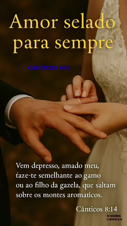 31/365 26 Amor selado para sempre | Cânticos 8:14 - Edmar - 30 segundos #cantares #canticodoscanticos #amorselado #30segundosmefitacao #31_365 Vem depressa, amado meu, faze-te semelhante ao gamo ou ao filho da gazela, que saltam sobre os montes aromáticos. Cânticos 8:14