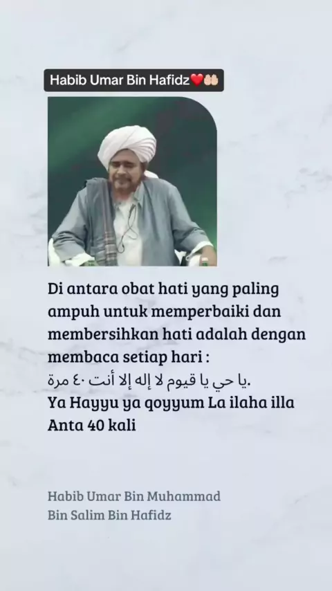Di antara obat hati yang paling ampuh untuk memperbaiki dan membersihkan hati adalah dengan membaca setiap hari: يَاحَيُّ يَا قَيُّومُ لَا إِلَٰهَ إِلَّا أَنْتَ سُبْحَانَكَ إِنِّي كُنْتُ مِنَ الظَّالِمِينَ Ya Hayyu ya Qayyum Lailaha illa Anta subhanaka inni kuntu minadhdhalimin 40 kali Dars fajar mesjid istiqlal 4 shofar 1445 H / 21 agustus 2023 Habib Umar Bin Muhammad Bin Salim Bin Hafidz Bin Syeikh Abu Bakar Bin Salim.