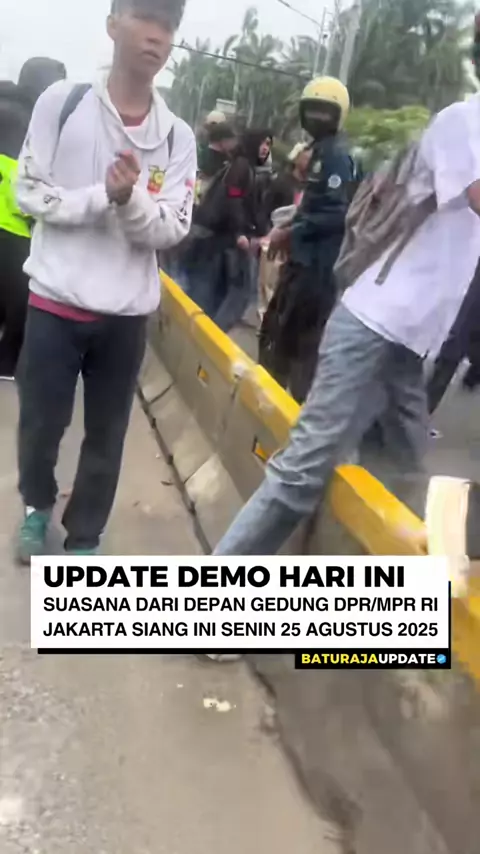 Situasi di depan Gedung DPR RI saat masa aksi menggelar unjuk rasa. Polisi yang berjaga menurunkan barikade keamanan dan menyemprotkan water canon guna memukul mundur para pendemo, Senin (25/08/2025) vt/bungaabadizz #baturajaupdate #demo #jakarta #dpr #indonesia More