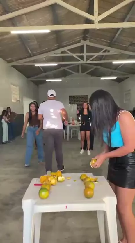 brincadeira de descascar laranja no chá de cozinha.