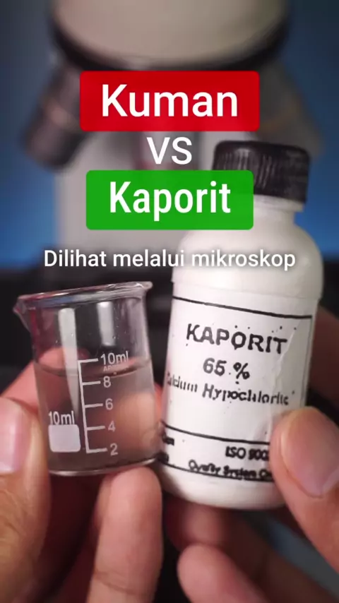 Begini cara kerja kaporit dalam membasmi kuman, saat dilihat menggunakan mikroskop. Kaporit, juga dikenal sebagai kalsium hipoklorit, adalah zat kimia yang umumnya digunakan sebagai desinfektan karena kemampuannya untuk membasmi kuman. Saat larut dalam air, kaporit akan mengeluarkan ion hipoklorit. Ion hipoklorit ini mengoksidasi molekul organik dan dapat menyebabkan kerusakan pada sel kuman. #kaporit #kuman #mikroskop #microscope #Mikroba