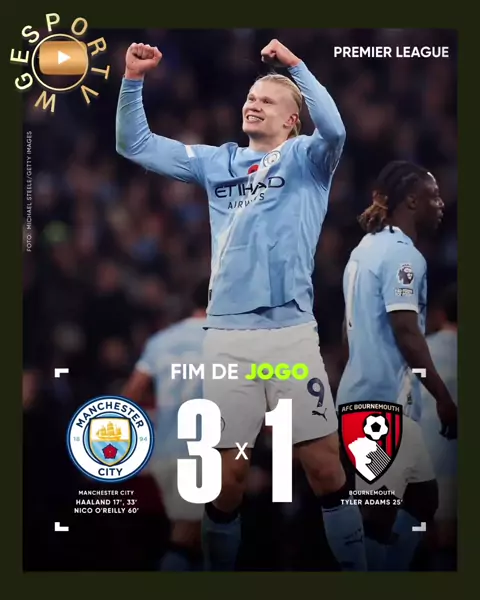 EM BUSCA DO TOPO! 👀 O artilheiro da Premier League crava duas vezes e garante a vitória dos Citizens contra o Bournemouth, na corrida atrás do líder Arsenal.