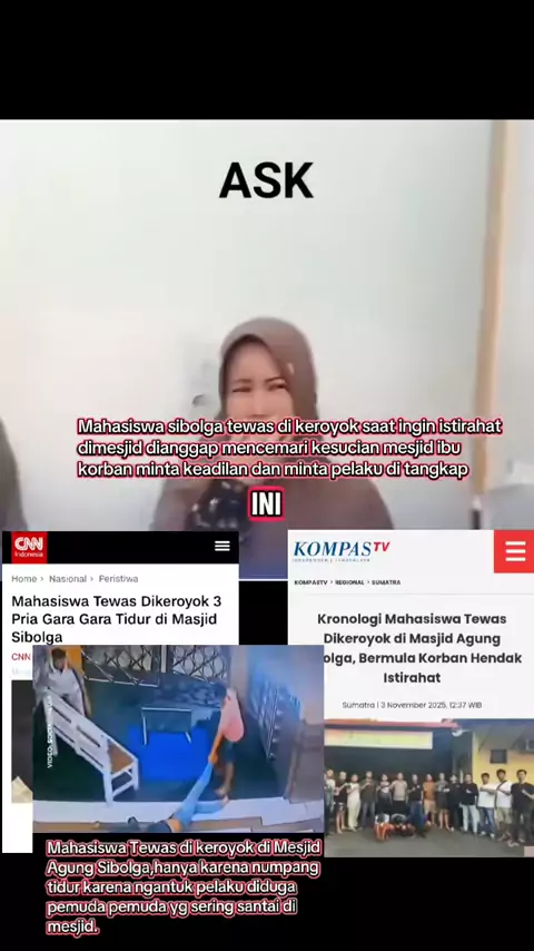 Seorang mahasiswa asal Tapanuli Tengah, Arjuna Tamaraya (21), tewas setelah dikeroyok lima pria di Masjid Agung Sibolga, Sumatera Utara, pada Jumat (31/10/2025) dini hari. Berdasarkan rekaman CCTV, korban yang hanya ingin beristirahat di masjid diseret keluar, dipukuli, dan dilempar buah kelapa oleh para pelaku sebelum sempat dilarikan ke rumah sakit. Arjuna meninggal akibat luka serius di kepala dan tubuh. Kepolisian Kota Sibolga telah menangkap tiga dari lima pelaku, sementara dua lainnya mas...