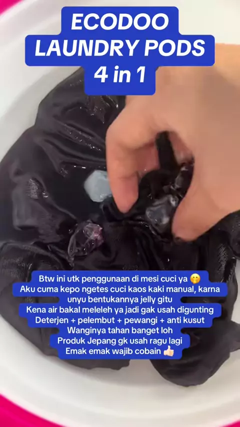 ECODOO LAUNDRY PODS 4 in 1 Btw ini utk penggunaan di mesi cuci ya ๐คญ Aku cuma kepo ngetes cuci kaos kaki manual, karna unyu bentukannya jelly gitu Kena air bakal meleleh ya jadi gak usah digunting Deterjen + pelembut + pewangi + anti kusut Wanginya tahan banget loh Produk Jepang gk usah ragu lagi Emak emak wajib cobain ๐๐ป #ecodoolaundrypods #ecodoolaundrygel #ecodoo #sabunmesincuci #sabuncairlaundry