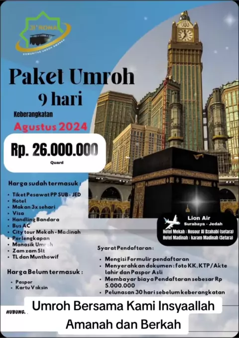 Assalamualaikum jamaah.. Umroh hemat di Bulan Agustus 2024 program 9 hari dengan jarak hotel 300 meter menuju pelataran masjid. ada potongan harga sampai dengan 2juta untuk pendaftaran sebwlum 20 Maret 2024.. untuk info lebih lanjut hubungi 082229331440#travelumroh #umrohamanah #viral #travelumrohsurabaya #semuabisaumroh #umrohsurabaya # #umroh2024🕋🤲