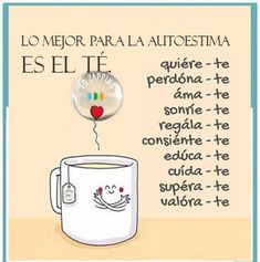 "Lo mejor para la autoestima es el té.Quiere - te. Perdona - te. Ama - te. Sonríe - te. Regala - te. Consiente - te. Educa - te. Cuida - te. Supera - te. Valora - te."